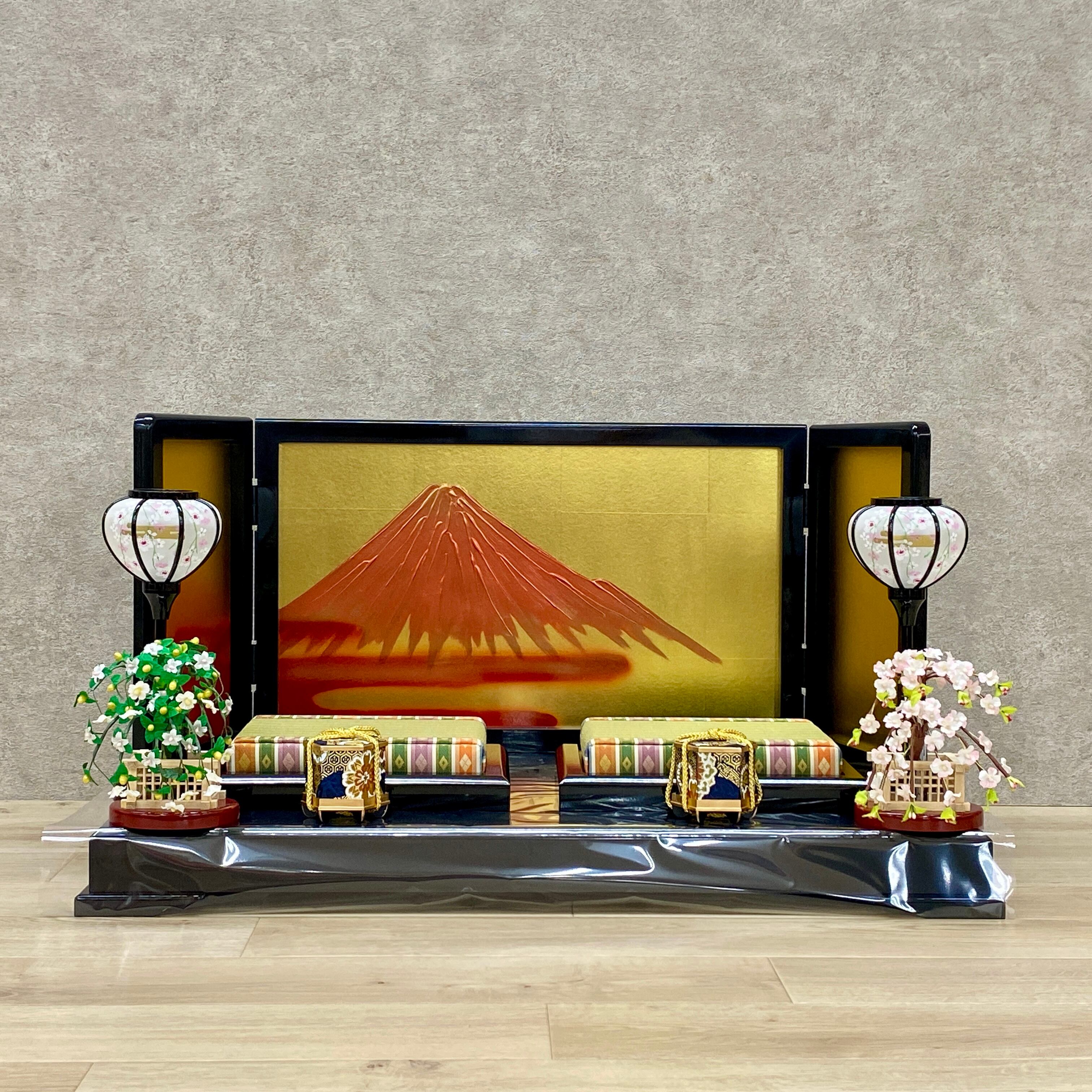 こちらの親王飾は、伝統的な和の美しさを表現しています。丁寧に塗られた黒塗りの屏風には蒔絵で赤富士が描かれています。