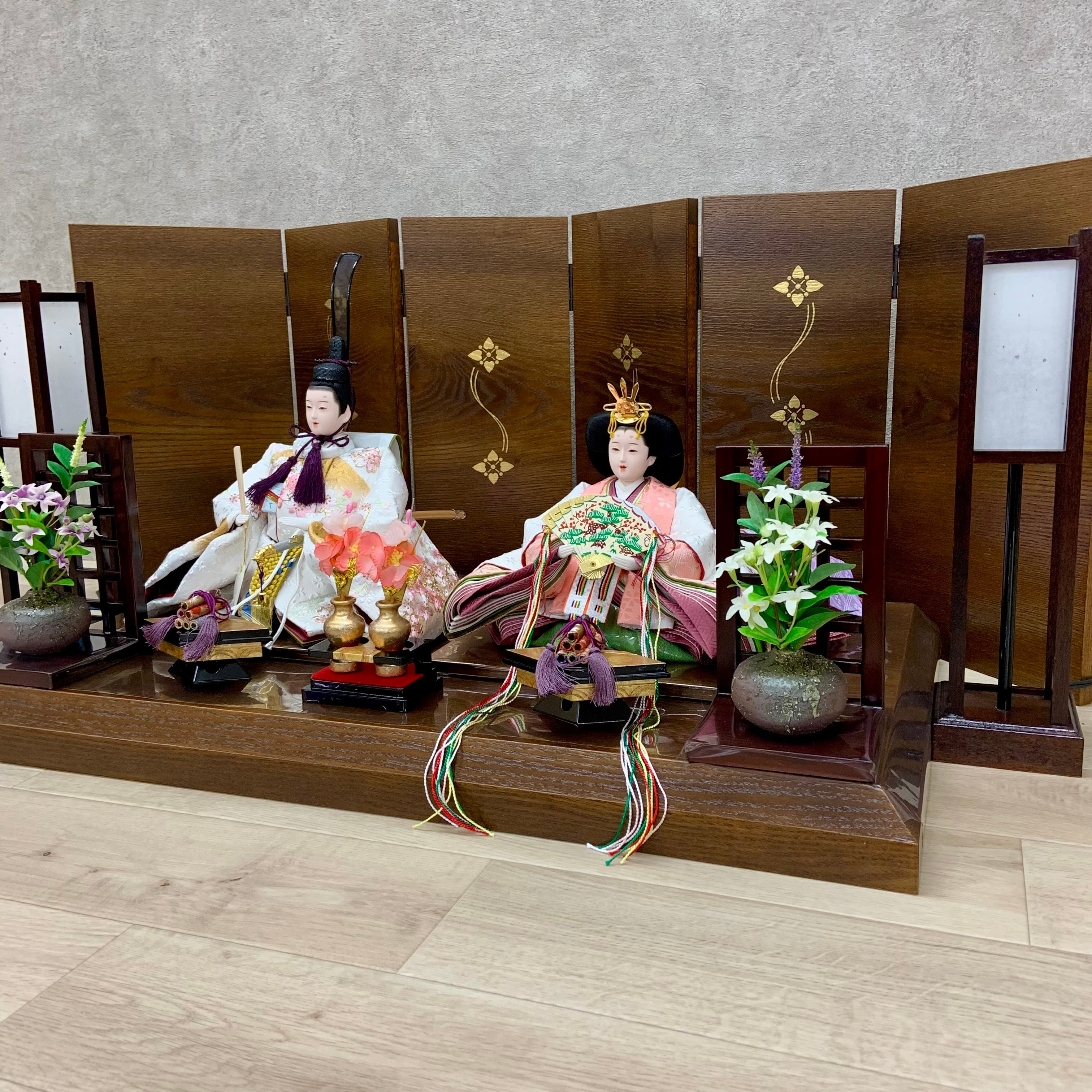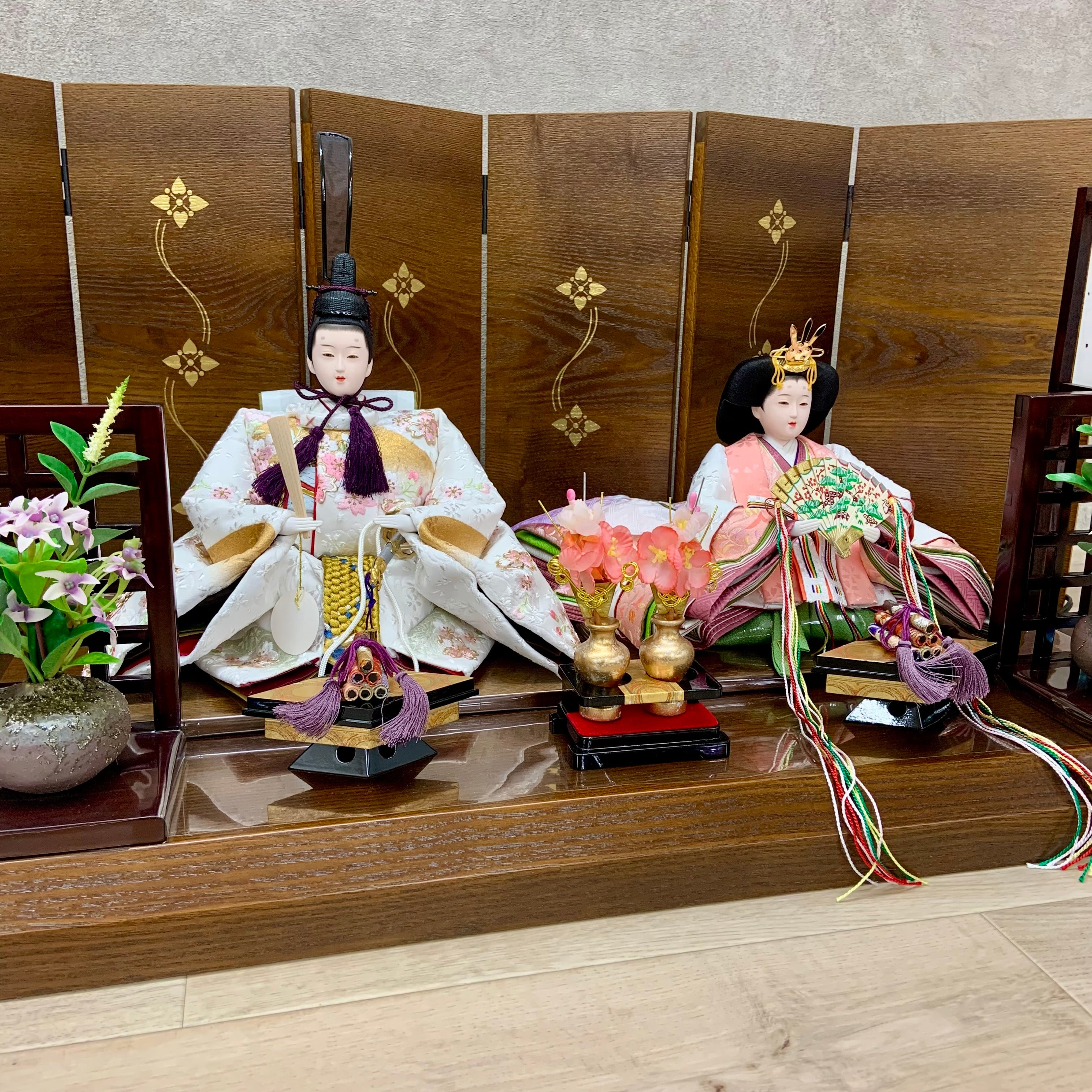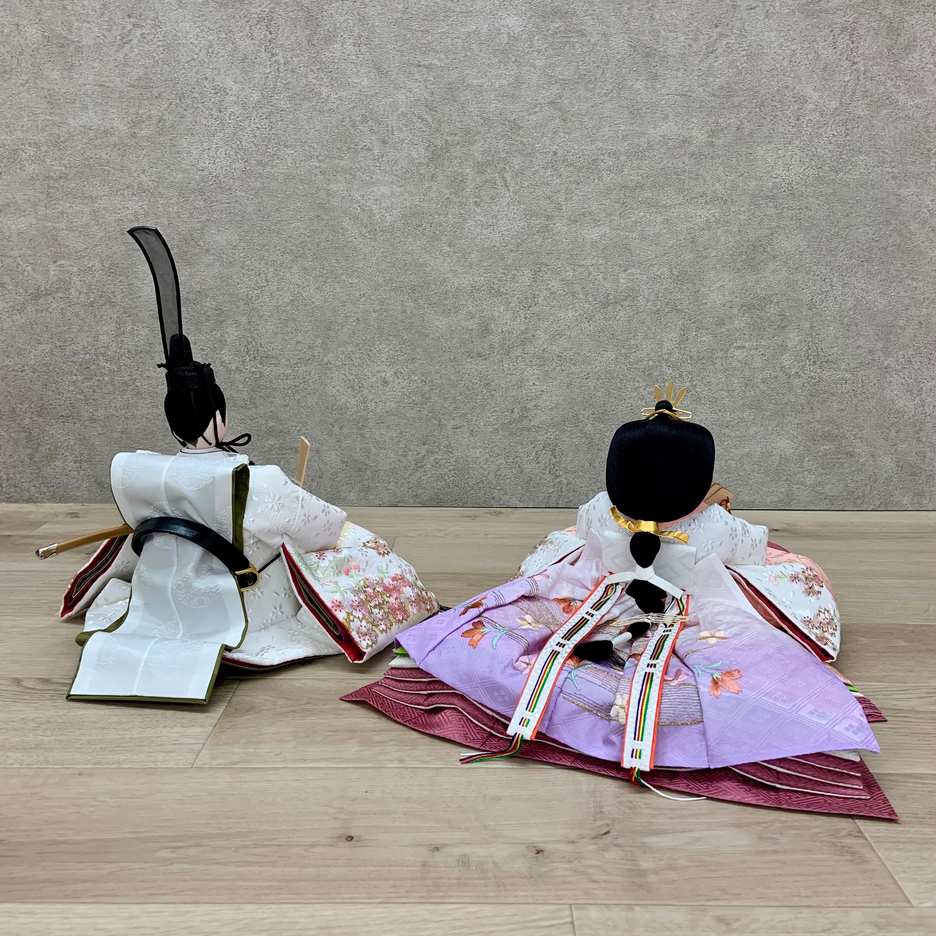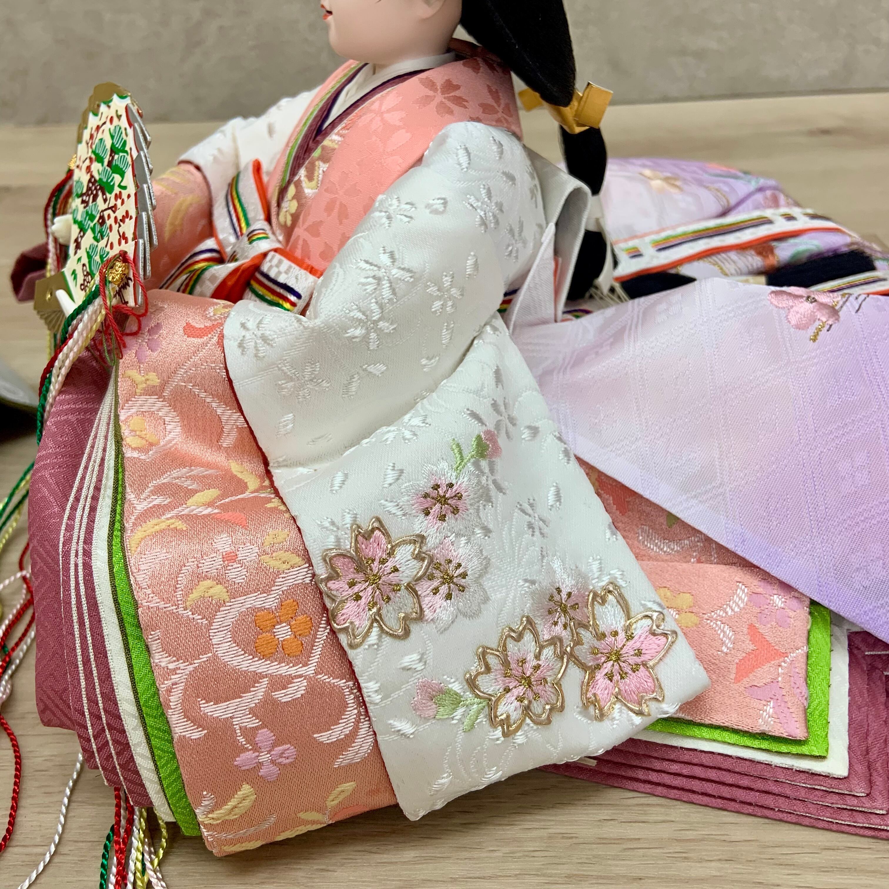 お雛様の着物は桜がテーマです。刺繍と金彩で可愛い桜の絵が描かれています。