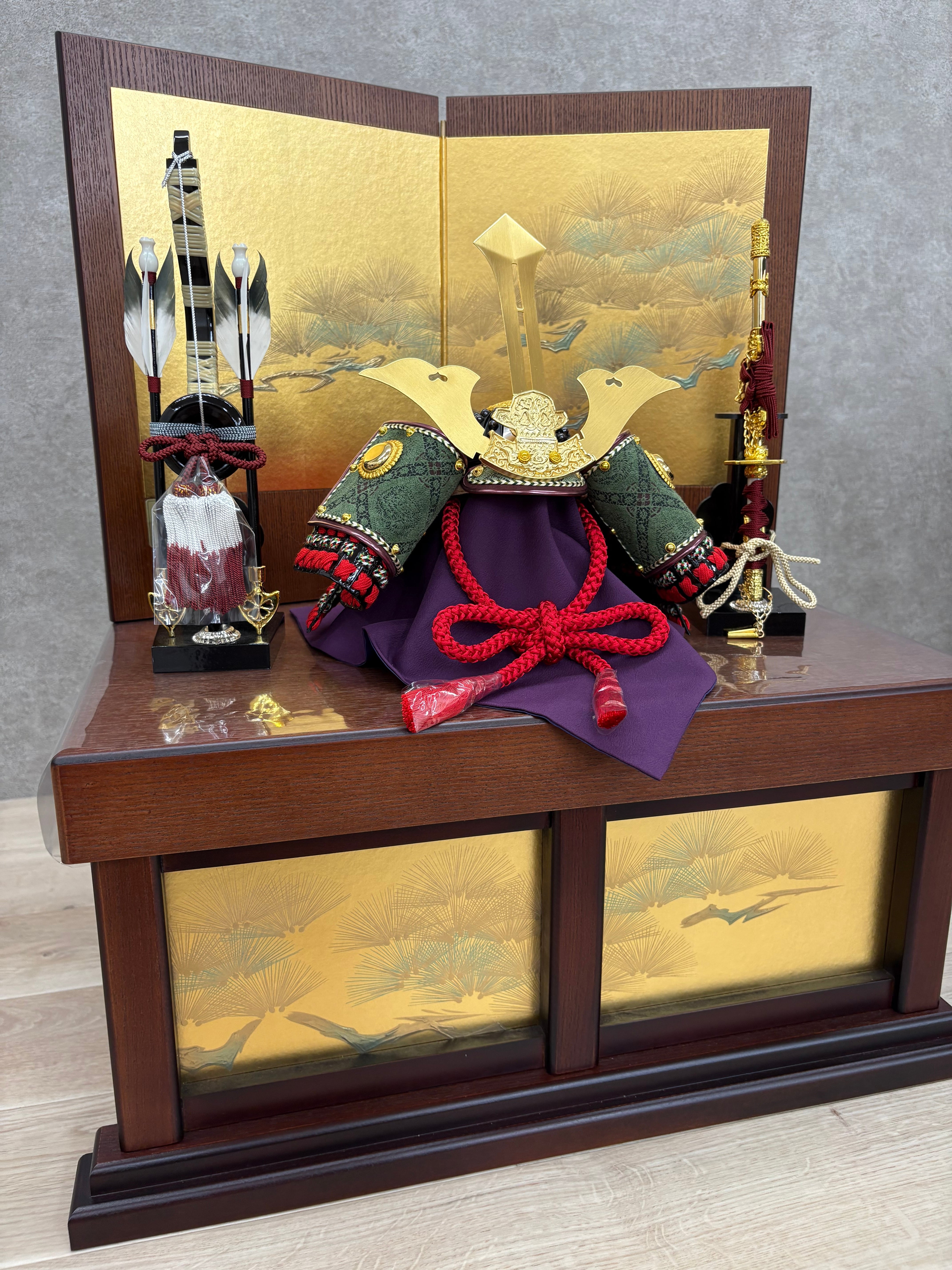 収納箱と屏風はウッディな感じですがデザインは縁起の良い松の絵柄を描いています