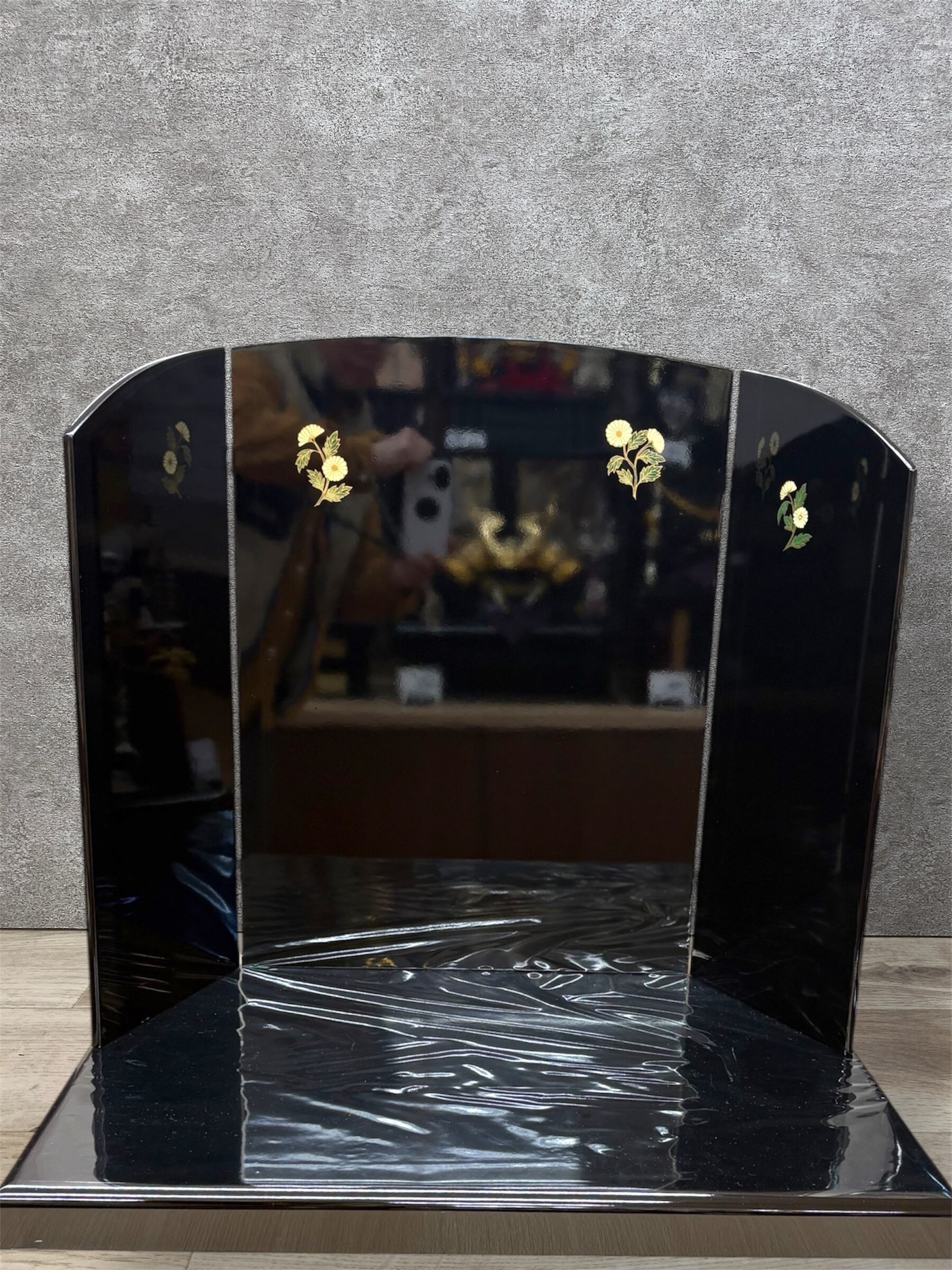 後ろの屏風は漆黒に塗って仕上げています