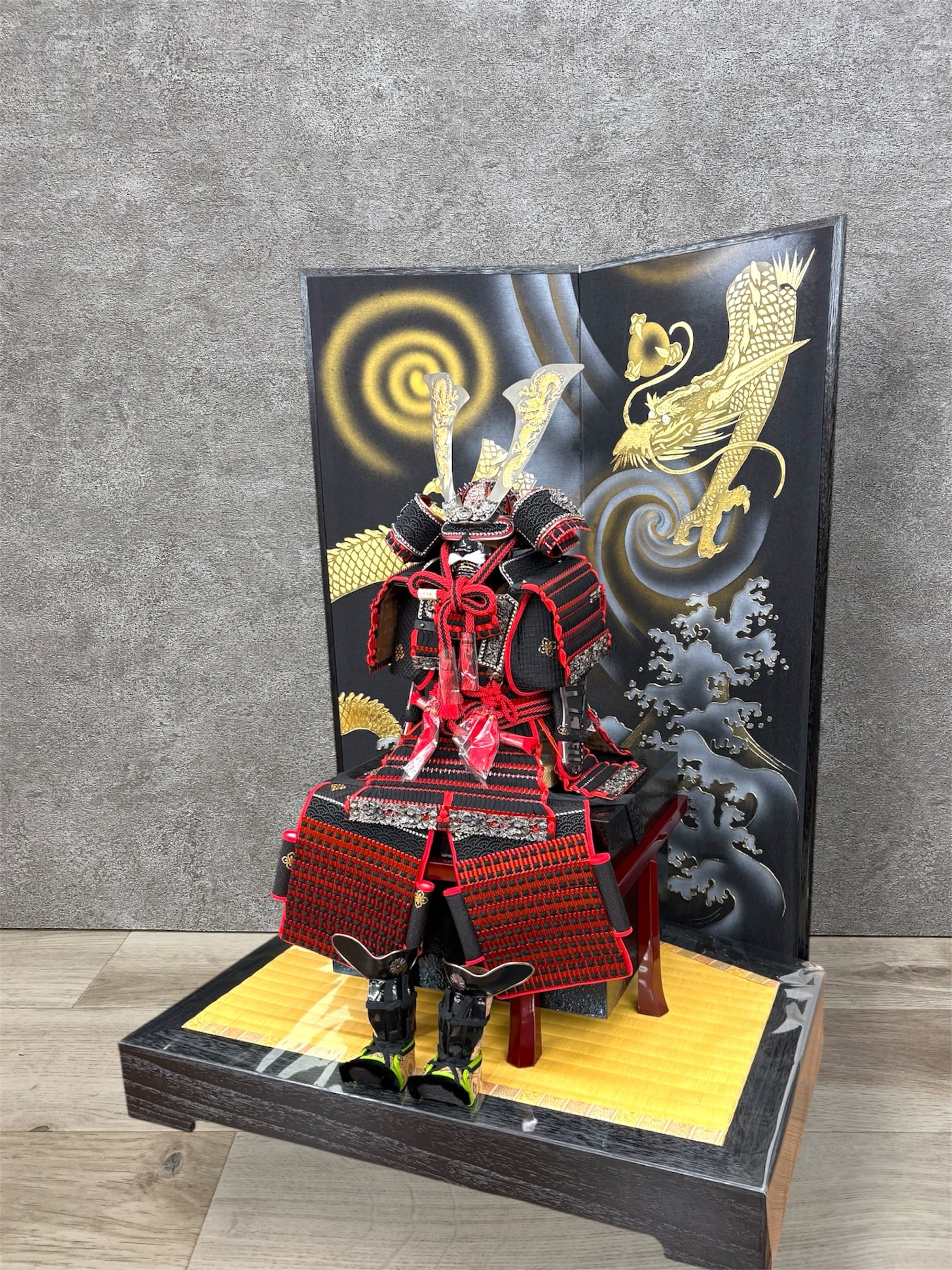 後ろの屏風には金色で