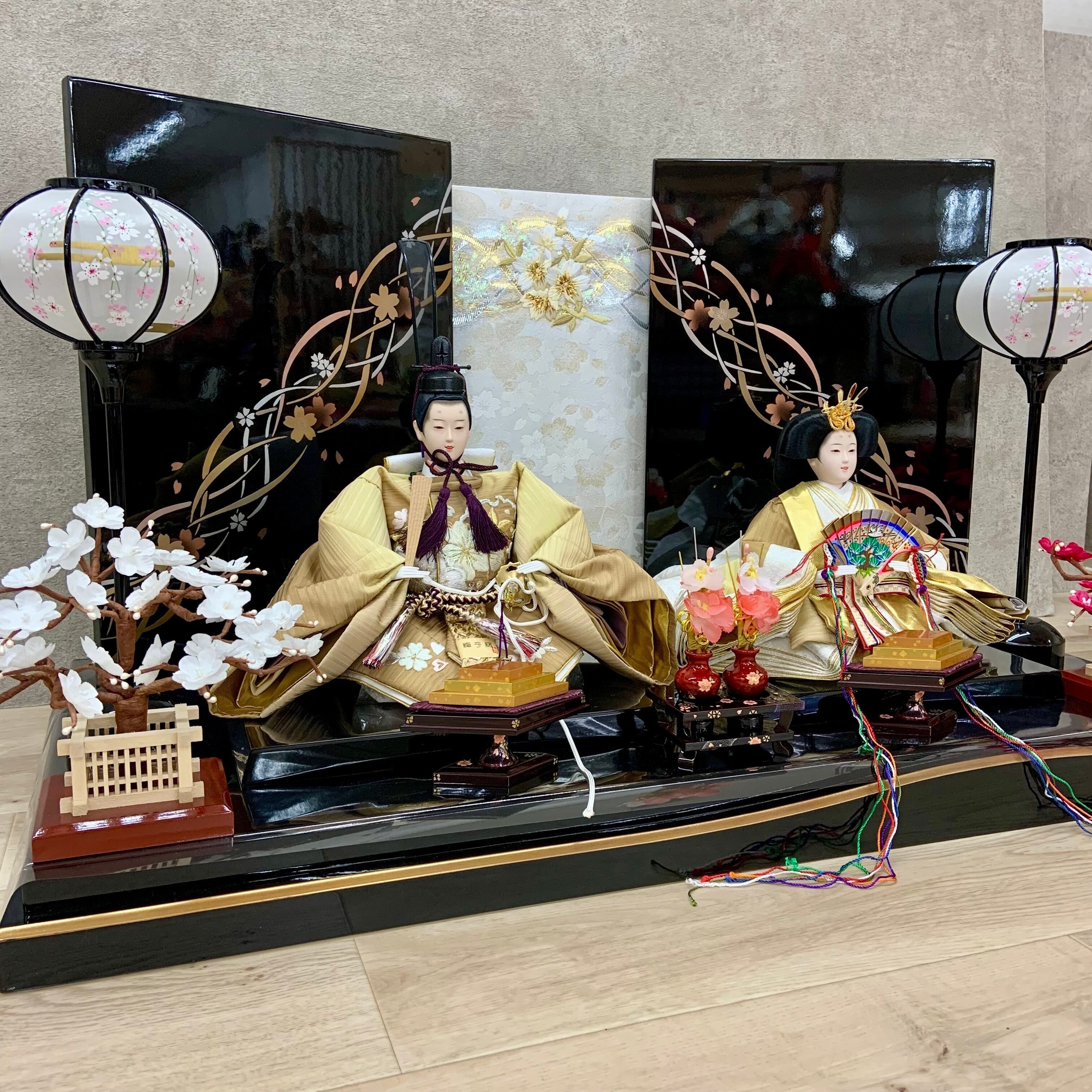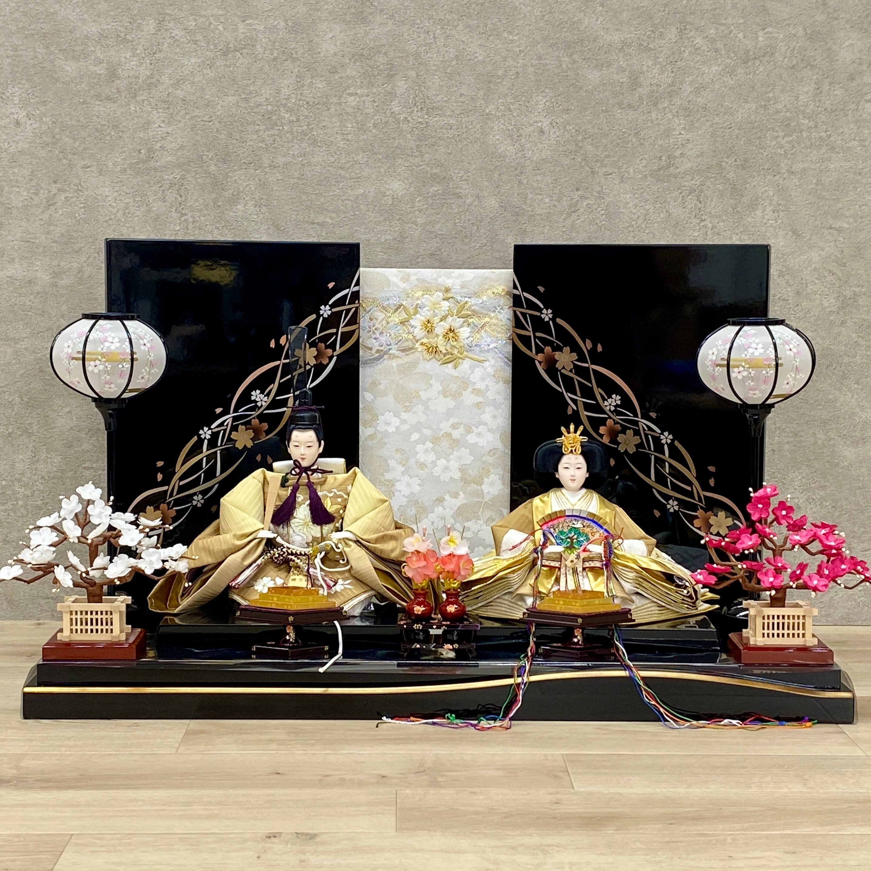 厳かな離宮をイメージした屏風を背景にした、優雅なお雛様です。