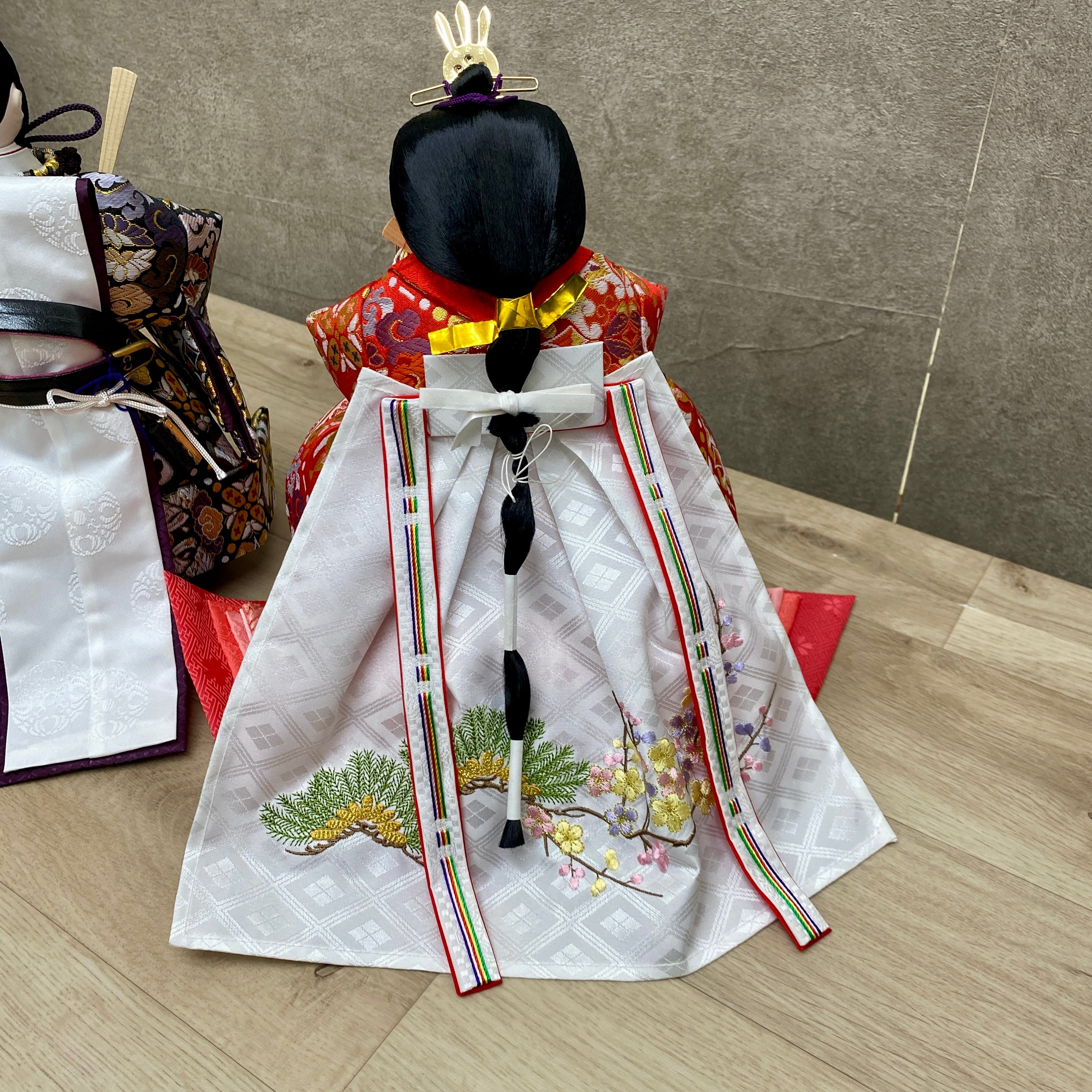 しだれ桜をバックに、優雅に佇むお雛様。色鮮やかな金蘭の衣装と、愛らしい表情が特徴です。