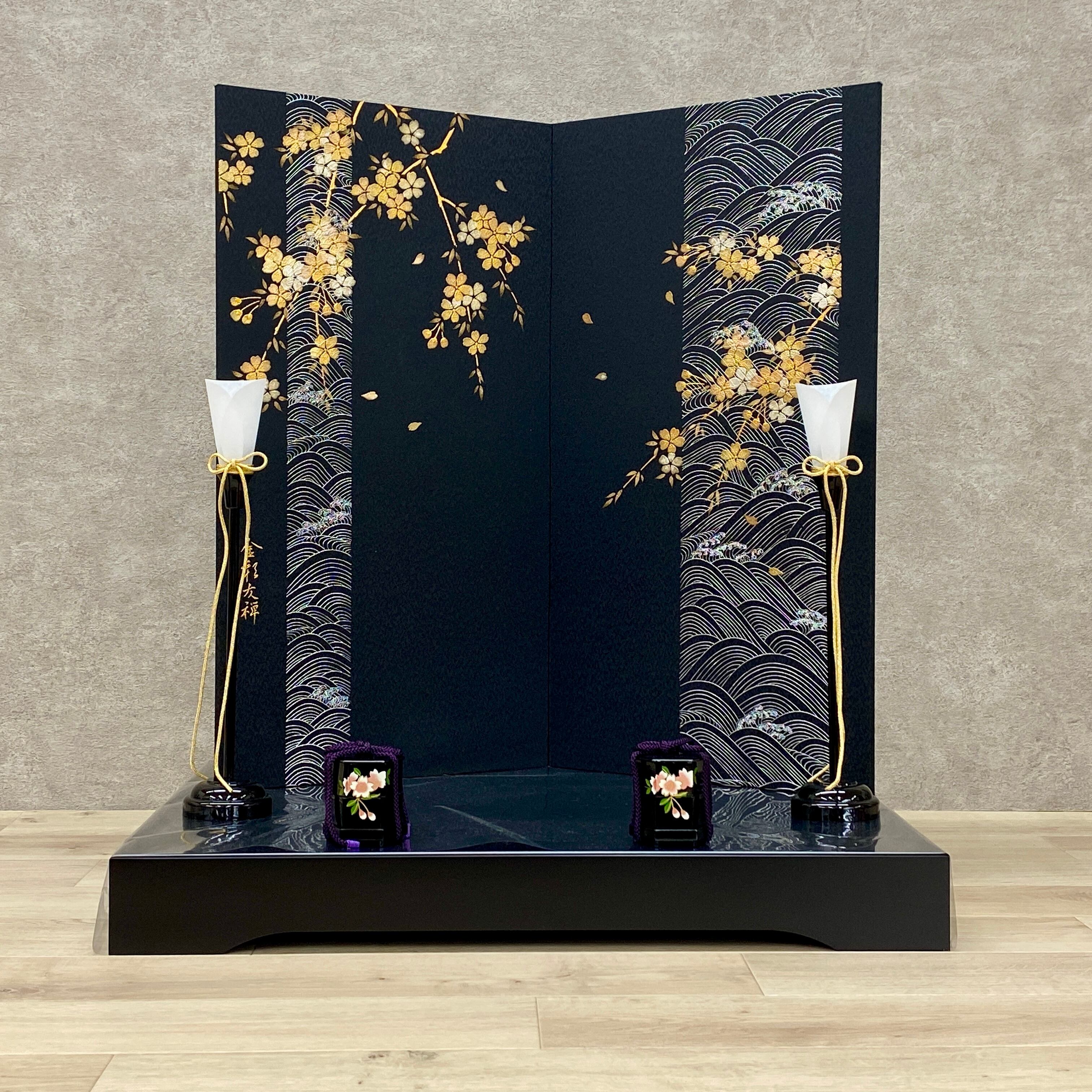 背面には、しだれ桜の美しいデザインが施された屏風が配置されており、優しい雰囲気を引き立てつつ、全体に華やかさを添えています。