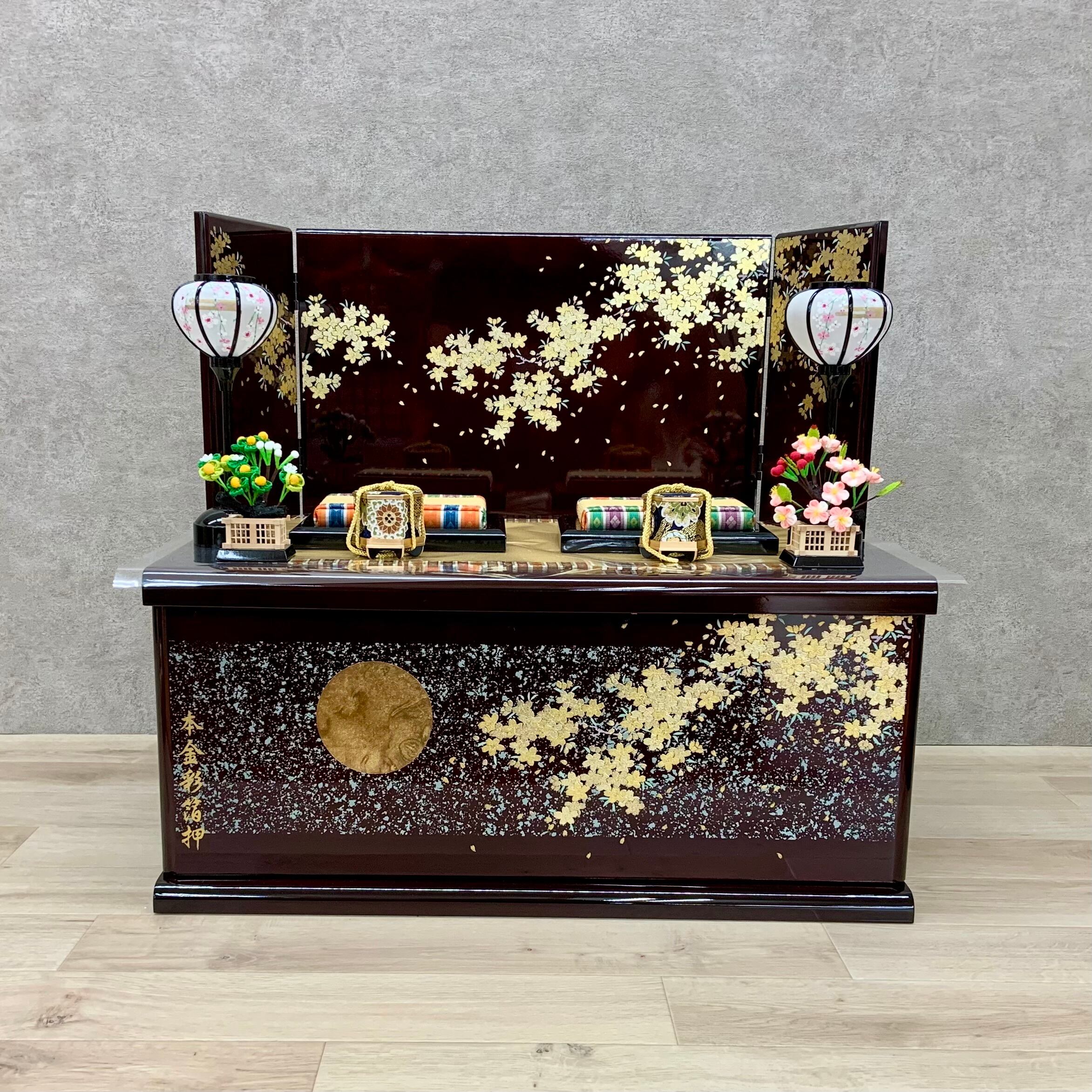 箱と屏風の色は黒ではなくマホガニーもなっており、飾り台は桜の華やかな模様を一層引き立て、シックでありながらエレガントな印象を演出します。